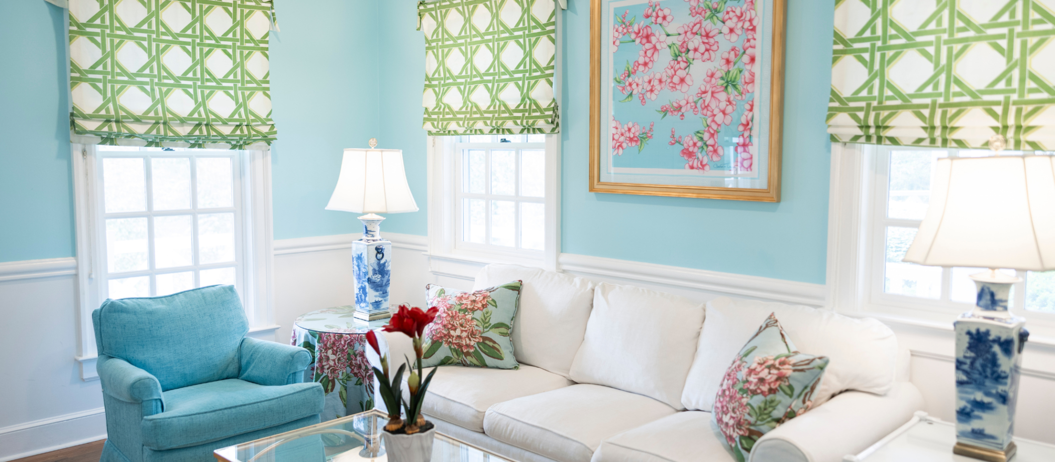 These cottages were renovated by private owners who purchased them & Greenbrier Interiors. Featuring fresh floor plans and unique designs, our Spring Row Cottage interiors showcase a kaleidoscope of colors with luxurious furnishings and fabrics.